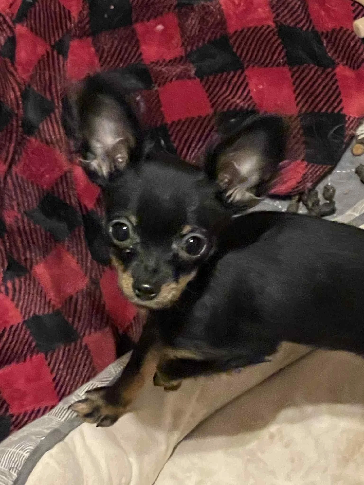 Demi is a 3 month old Russian Toy Terrier. She is 2 pounds right now, likely to end up at 5-6 pounds fully grown. Demi is friendly and outgoing, she loves to play and cuddle! She is currently with other small dogs in her foster home and she's doing well with them. She's working hard at potty training and big girl manners. She will be the perfect little companion, but due to her size, we are asking for her to go to a home with older children. Demi will be adopted on a spay contract. Her fee is $700.